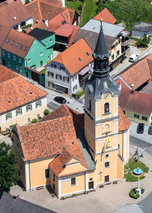Die schon 1158 genannte Kirche ist dem heiligen Erzengel Michael geweiht. Vermutlich stand hier zuerst eine Holzkirche. Über den Bau der jetzigen barocken Kirche, die in Kreuzform errichtet wurde, besitzen wir keine urkundlichen Belege, doch dürfte der älteste Teil des Glockenturms an der Südseite noch in die gotische Epoche zurückreichen. Gewiss wurde die Kirche bei den Überfällen der Türken in den Jahren 1529 und 1532 schwerstens in Mitleidenschaft gezogen, vielleicht sogar zerstört, doch anscheinend nicht niedergebrannt.
